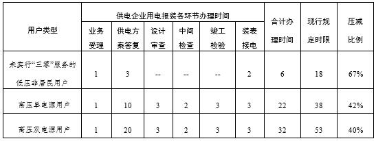 ——辦電更省時。2020年底前,電力接入工程項目行政審批時間,低壓、20kV及以下高壓工程分別壓減至5個、10個工作日以內;供電企業(yè)辦理用電報裝業(yè)務各環(huán)節(jié)合計時間,未實行“三零”服務的低壓非居民用戶、高壓單電源用戶、高壓雙電源用戶分別壓減至6個、22個、32個工作日以內,在現行規(guī)定基礎上壓縮40%以上(詳見附表);全過程辦理時間(從報裝申請到裝表接電),居民用戶、實行“三零”服務的低壓非居民用戶分別壓減至5個、25個工作日以內。2021、2022年底前,實行“三零”服務的低壓非居民用戶全過程辦理時間分別壓減至20個、15個工作日以內。