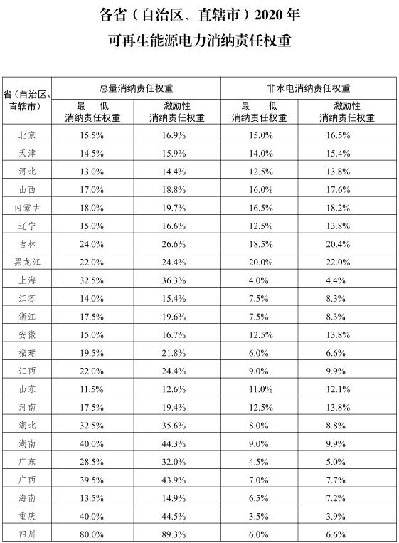 發(fā)改委 能源局印發(fā)各省級(jí)行政區(qū)域2020年可再生能源電力消納責(zé)任權(quán)重