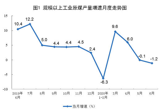 原煤生產(chǎn)小幅下降。6月份,生產(chǎn)原煤3.3億噸,同比下降1.2%,降幅比上月擴(kuò)大1.1個(gè)百分點(diǎn);日均產(chǎn)量1114萬(wàn)噸,環(huán)比增加86萬(wàn)噸。上半年,生產(chǎn)原煤18.1億噸,同比增長(zhǎng)0.6%,一季度為下降0.5%。