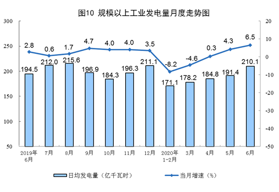 電力生產(chǎn)繼續(xù)加快。6月份,發(fā)電量6304億千瓦時(shí),同比增長(zhǎng)6.5%,增速比上月加快2.2個(gè)百分點(diǎn);日均發(fā)電量210.1億千瓦時(shí),環(huán)比增加18.7億千瓦時(shí)。上半年,發(fā)電量33645億千瓦時(shí),同比下降1.4%,降幅比一季度收窄5.4個(gè)百分點(diǎn)。
