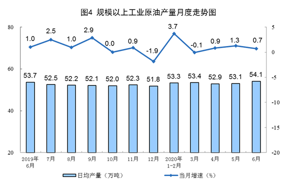 原油生產(chǎn)略有增長(zhǎng),加工量有所加快。6月份,生產(chǎn)原油1624萬(wàn)噸,同比增長(zhǎng)0.7%,增速比上月回落0.6個(gè)百分點(diǎn);加工原油5787萬(wàn)噸,增長(zhǎng)9.0%,比上月加快0.8個(gè)百分點(diǎn)。上半年,生產(chǎn)原油9715萬(wàn)噸,同比增長(zhǎng)1.7%,比一季度放緩0.7個(gè)百分點(diǎn);加工原油3.2億噸,同比增長(zhǎng)0.6%,一季度為下降4.6%。