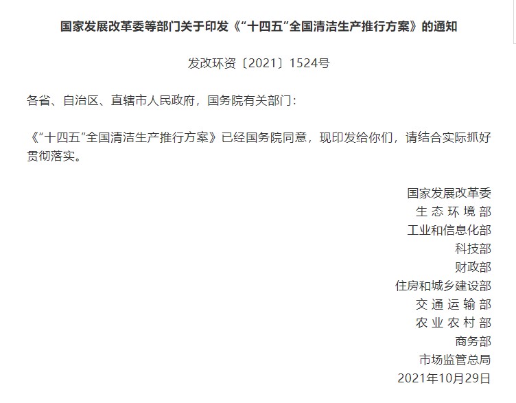 11月9日,國家發(fā)改委網(wǎng)站發(fā)布消息,國家發(fā)改委等十部門印發(fā)《“十四五”全國清潔生產(chǎn)推行方案》。