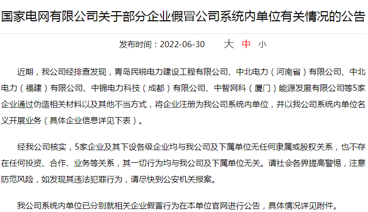 本網(wǎng)訊 6月30日,國家電網(wǎng)官網(wǎng)發(fā)布“國家電網(wǎng)有限公司關(guān)于部分企業(yè)假冒公司系統(tǒng)內(nèi)單位有關(guān)情況的公告”。