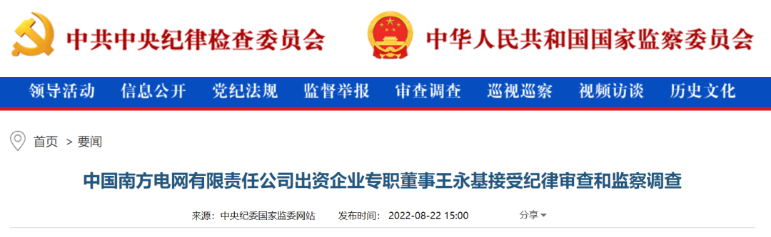 中紀(jì)委網(wǎng)站8月22日消息,中國(guó)南方電網(wǎng)有限責(zé)任公司出資企業(yè)專(zhuān)職董事王永基涉嫌嚴(yán)重違紀(jì)違法,目前正接受中國(guó)南方電網(wǎng)有限責(zé)任公司紀(jì)檢監(jiān)察組紀(jì)律審查和廣東省肇慶市監(jiān)察委員會(huì)監(jiān)察調(diào)查。