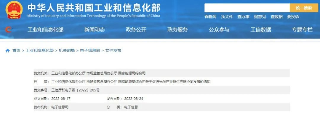 本網訊 8月24日,工信部辦公廳、市場監(jiān)管總局辦公廳、國家能源局綜合司發(fā)布《三部門關于促進光伏產業(yè)鏈供應鏈協同發(fā)展的通知》。