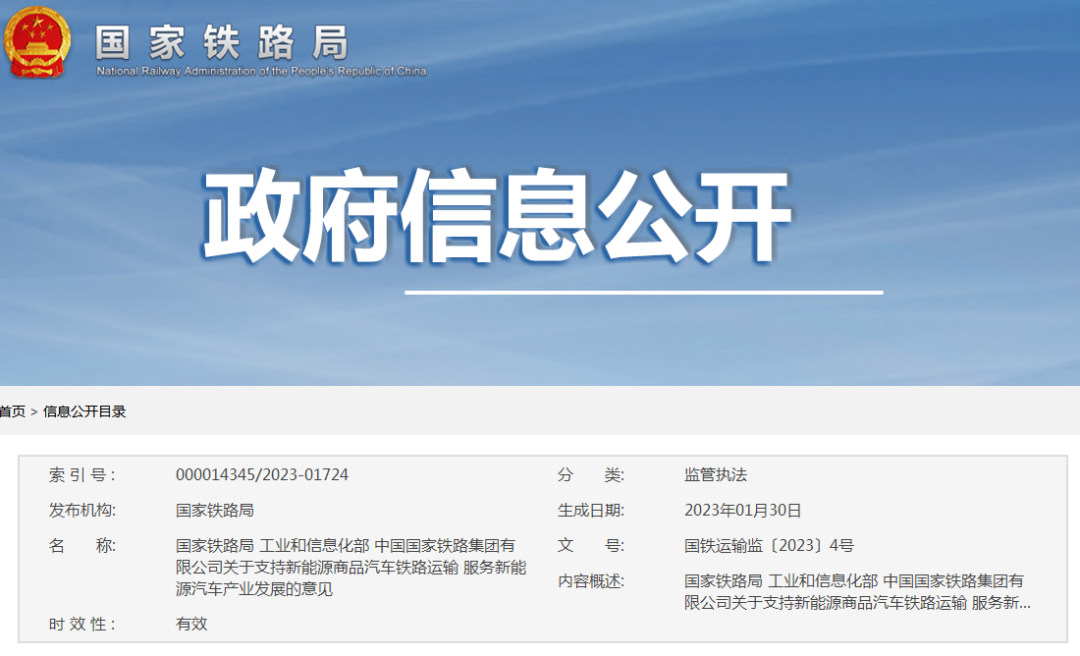 國家鐵路局 工業(yè)和信息化部 中國國家鐵路集團(tuán)有限公司關(guān)于支持新能源商品汽車鐵路運輸 服務(wù)新能源汽車產(chǎn)業(yè)發(fā)展的意見