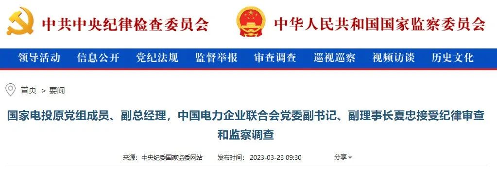 中央紀(jì)委國(guó)家監(jiān)委網(wǎng)站3月23日消息,國(guó)家電投原黨組成員、副總經(jīng)理,中國(guó)電力企業(yè)聯(lián)合會(huì)黨委副書記、副理事長(zhǎng)夏忠涉嫌嚴(yán)重違紀(jì)違法,目前正接受中央紀(jì)委國(guó)家監(jiān)委駐國(guó)務(wù)院國(guó)資委紀(jì)檢監(jiān)察組和遼寧省盤錦市監(jiān)委紀(jì)律審查和監(jiān)察調(diào)查。
