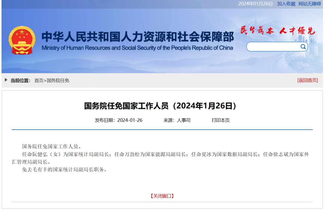 任命阮健弘(女)為國家統(tǒng)計(jì)局副局長(zhǎng);任命萬勁松為國家能源局副局長(zhǎng);任命夏冰為國家數(shù)據(jù)局副局長(zhǎng);任命徐志斌為國家外匯管理局副局長(zhǎng)。