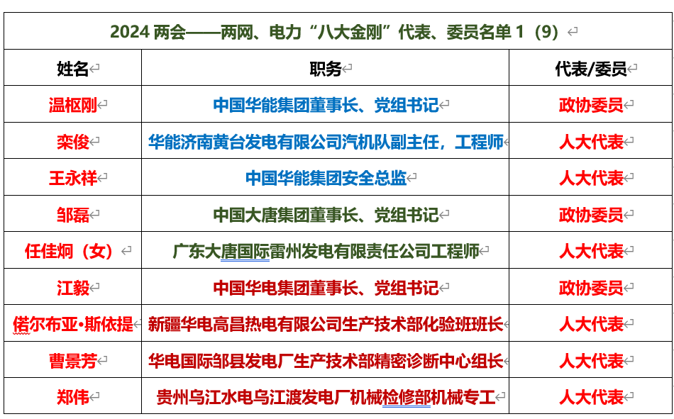 電力“八大金剛”代表委員名單: