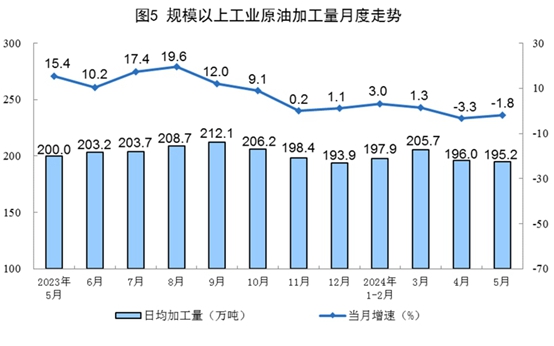 原油生產(chǎn)平穩(wěn)增長,進(jìn)口由增轉(zhuǎn)降。5月份,規(guī)上工業(yè)原油產(chǎn)量1815萬噸,同比增長0.6%,增速比4月份放緩0.7個百分點(diǎn);日均產(chǎn)量58.5萬噸。進(jìn)口原油4697萬噸,同比下降8.7%。