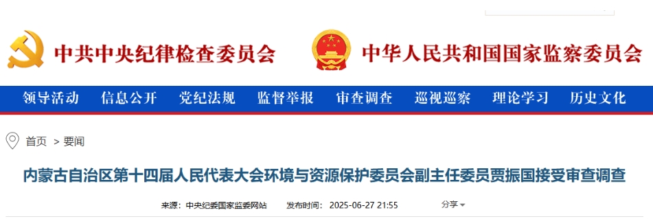 中央紀(jì)委國家監(jiān)委網(wǎng)站6月27日消息,據(jù)內(nèi)蒙古自治區(qū)紀(jì)委監(jiān)委消息:內(nèi)蒙古自治區(qū)第十四屆人民代表大會(huì)環(huán)境與資源保護(hù)委員會(huì)副主任委員賈振國涉嫌嚴(yán)重違紀(jì)違法,目前正接受內(nèi)蒙古自治區(qū)紀(jì)委監(jiān)委紀(jì)律審查和監(jiān)察調(diào)查。