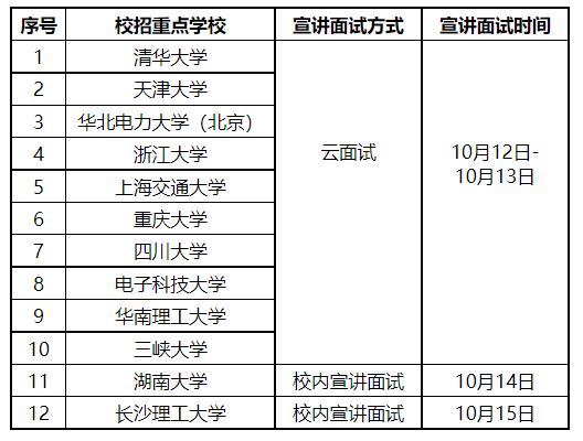 因疫情影響,國網(wǎng)湖南電力2023年校園招聘長沙站采取“校內(nèi)宣講面試”,省外其他重點(diǎn)院校采取“云面試”方式開展,宣講面試安排如下(招聘單位及招聘條件詳見前期發(fā)布的招聘公告):