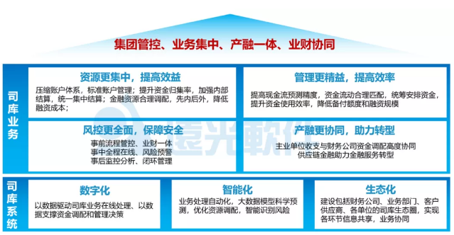 結(jié)合集團(tuán)企業(yè)發(fā)展需求和業(yè)界實(shí)踐經(jīng)驗(yàn),司庫(kù)管理體系建設(shè)需滿足“資源更集中、管理更精益、風(fēng)控更全面、產(chǎn)融更協(xié)同”四個(gè)標(biāo)準(zhǔn),以數(shù)字化、智能化的司庫(kù)管理信息系統(tǒng)為支撐,以“集團(tuán)管控、業(yè)務(wù)集中、產(chǎn)融一體、業(yè)務(wù)協(xié)同”為管理目標(biāo)。