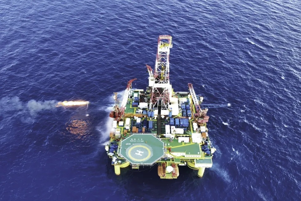 “深藍(lán)探索”在開平南油田進(jìn)行鉆探作業(yè),噴射鉆頭正在入井
