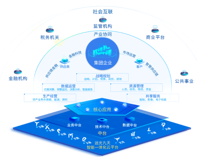 在傳統(tǒng)的企業(yè)內(nèi)部人力、物力、財(cái)力等資源要素管理基礎(chǔ)上,擴(kuò)展戰(zhàn)略規(guī)劃、生產(chǎn)經(jīng)營(yíng)、共享服務(wù)、數(shù)據(jù)運(yùn)營(yíng)等四個(gè)領(lǐng)域的核心應(yīng)用,將先進(jìn)數(shù)字技術(shù)與企業(yè)資源管理、業(yè)務(wù)運(yùn)營(yíng)深度融合,通過(guò)一套系統(tǒng)同時(shí)滿足企業(yè)不同層級(jí)、不同業(yè)務(wù)領(lǐng)域的數(shù)字化需求。同時(shí),依托可擴(kuò)展的平臺(tái)能力,共享基于先進(jìn)業(yè)務(wù)實(shí)踐沉淀的新業(yè)務(wù)、新理念管理模型,彈性支撐業(yè)務(wù)發(fā)展,為全業(yè)務(wù)進(jìn)行賦能。
