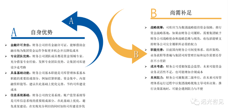 有不少企業(yè)會(huì)有困惑,是否可以以財(cái)務(wù)公司為基礎(chǔ)構(gòu)建司庫(kù)管理體系?這個(gè)不建議直接用“是\否”來(lái)回答,或許回答“部分可以”會(huì)比較適宜。從財(cái)務(wù)公司優(yōu)勢(shì)和可能存在的不足兩個(gè)角度進(jìn)行簡(jiǎn)要分析,如圖: