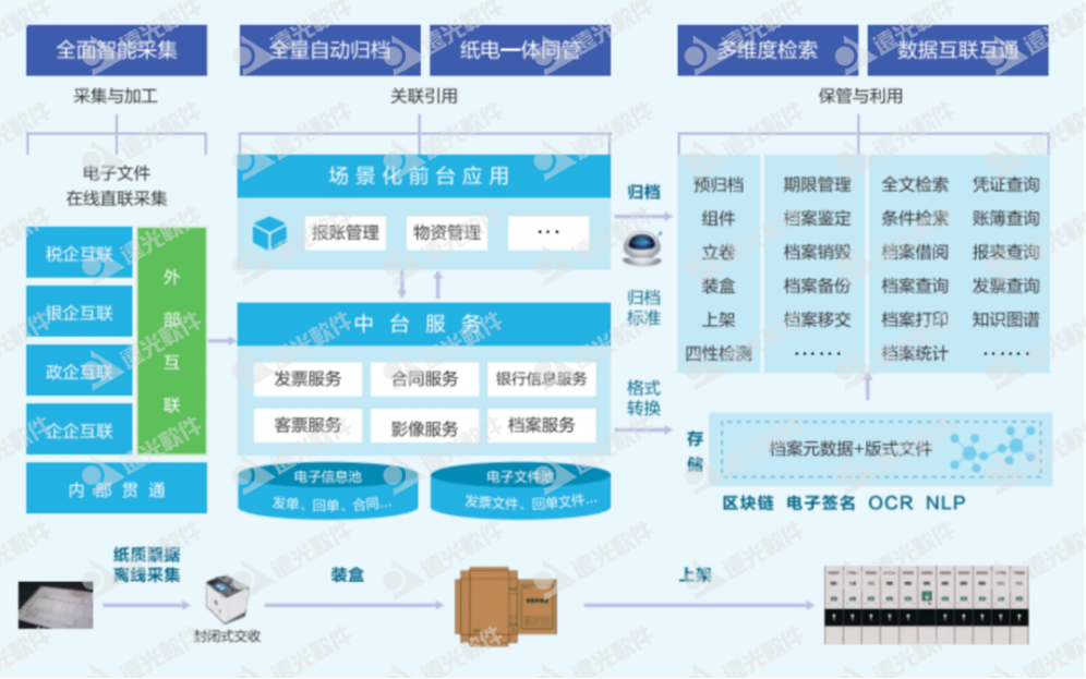 遠光“智慧檔案”是遠光軟件基于在電子檔案多年的研究與實踐,深度融合區(qū)塊鏈、人工智能、大數(shù)據(jù)、邊緣計算、物聯(lián)網(wǎng)等新興技術(shù),精研軟硬一體化整合應(yīng)用,遵循電子票證管理標準和規(guī)范,將電子檔案系統(tǒng)與智能設(shè)備相結(jié)合,推出的全新一體化解決方案,滿足了企業(yè)對檔案的全生命周期流程的管理需求,為檔案管理工作進行全面賦能。