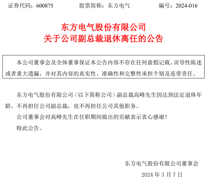 3月7日晚間,東方電氣股份有限公司(簡稱:東方電氣)發(fā)布關(guān)于公司副總裁退休離任的公告。