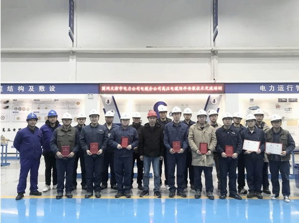 其中,2023年組織國網(wǎng)客戶(包括國網(wǎng)天津市電力公司電纜分公司、國網(wǎng)石家莊供電公司、國網(wǎng)濟南供電公司、國網(wǎng)南昌供電公司、國網(wǎng)保定供電公司、國網(wǎng)鄭州供電公司電纜運檢中心、國網(wǎng)長沙供電公司電纜檢修公司、國網(wǎng)四川省電力公司成都供電公司等)來司開展高壓電纜附件安裝培訓(xùn)共計9場,參訓(xùn)學(xué)員48人,累計培訓(xùn)學(xué)時584小時;受國網(wǎng)客戶單位邀請開展各類技能比武、安裝技能提升培訓(xùn)指導(dǎo)服務(wù)共計12次,累計培訓(xùn)、指導(dǎo)課時418小時。2024年2月底到3月初,為國網(wǎng)天津市電力公司電纜分公司的15名青年職工提供為期5天的專業(yè)培訓(xùn)。