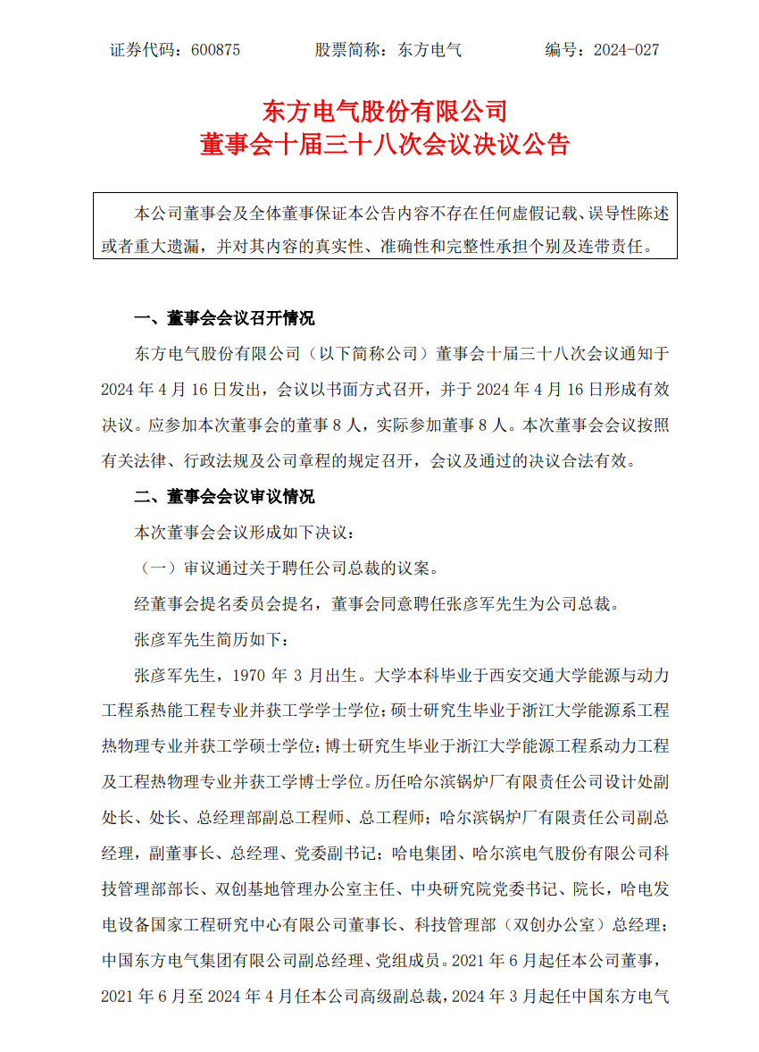 4月16日,東方電氣發(fā)布公告稱,公司董事會十屆三十八次會議通知于4月16日發(fā)出,會議以書面方式召開,并于4月16日形成有效決議。本次董事會審議通過關(guān)于聘任公司總裁的議案,同意聘任張彥軍先生為公司總裁。