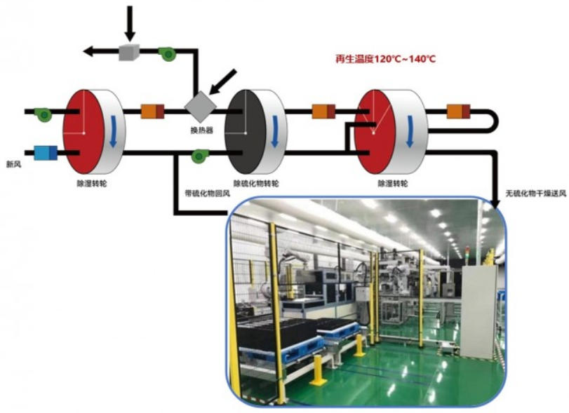 適合于大風(fēng)量并且超級節(jié)能的固態(tài)電池工廠,采用多級除濕轉(zhuǎn)輪的方案,再生溫度低,70-90℃,適配低品位熱源,為超級節(jié)能系統(tǒng)。