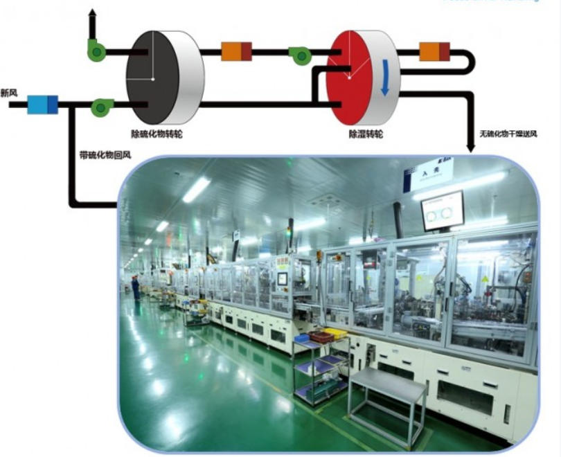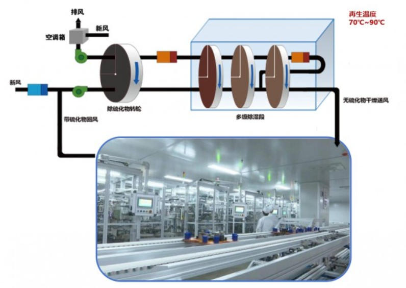 生產(chǎn)車間中濃度較低的H?S 氣體,會(huì)被除濕系統(tǒng)的負(fù)壓回風(fēng)帶入除濕機(jī)內(nèi)部。該除濕機(jī)裝有活性炭過濾器/除硫轉(zhuǎn)輪,可先吸附硫化氫,再進(jìn)行除濕。