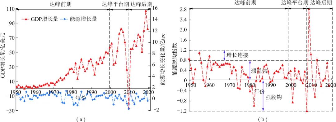 研究人員根據(jù)現(xiàn)代化進(jìn)程、能源消費(fèi)和碳排放趨勢(shì),將美國(guó)碳排放分三個(gè)階段:即碳達(dá)峰前期(1949—1999年)、碳達(dá)峰平臺(tái)期(2000—2008年)、碳達(dá)峰后期(2009年至今)。依據(jù)Tapio彈性分析法對(duì)美國(guó)能源消耗與GDP增長(zhǎng)的脫鉤程度進(jìn)行定量分析后,得到如下認(rèn)識(shí):
