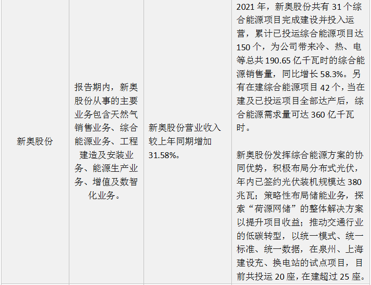 新奧股份2021年年度報(bào)告顯示,報(bào)告期內(nèi),公司營業(yè)收入較上年同期增加31.58%,主要是公司所屬子公司天然氣業(yè)務(wù)(零售、批發(fā)、直銷)氣量增加、單價(jià)上漲,以及綜合能源業(yè)務(wù)快速增長所致。在綜合能源業(yè)務(wù)方面,新奧股份重點(diǎn)開發(fā)低碳園區(qū)、低碳工廠、低碳建筑、低碳交通四大類客戶,以綠色低碳整體解決方案切入,大力發(fā)展終端節(jié)能、工藝優(yōu)化、能源設(shè)施托管運(yùn)營等用能側(cè)服務(wù)業(yè)務(wù)。