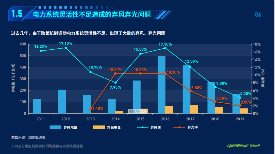 目前,中國(guó)以煤電為主的電力系統(tǒng)靈活性嚴(yán)重不足,電力系統(tǒng)的僵化導(dǎo)致了棄風(fēng)、棄光問(wèn)題的出現(xiàn)。2011-2019年,中國(guó)的棄風(fēng)和棄光率一度高達(dá)17.1%和10.5%,造成了大量發(fā)電資源的浪費(fèi)。2016-2018年間,中國(guó)棄風(fēng)和棄光電量共計(jì)1389億千瓦時(shí) ,相當(dāng)于約3000萬(wàn)千瓦煤電廠的發(fā)電量。