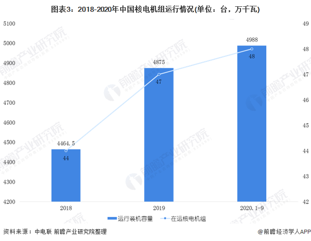 截至2019年底,中國在運(yùn)核電機(jī)組共47臺(tái),分別位于8個(gè)沿海省份的13個(gè)核電基地中,運(yùn)行裝機(jī)容量達(dá)到4875萬千瓦,位居世界第三,占全國總裝機(jī)容量的2.5%左右。截止2020年9月底,中國在運(yùn)核電機(jī)組48臺(tái),總裝機(jī)容量4988萬千瓦。