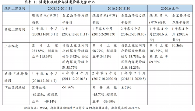 庫(kù)存同比低位+火電產(chǎn)量同比相對(duì)高位是煤炭?jī)r(jià)格和煤炭股啟動(dòng)信號(hào)。2016年的煤炭股行情與今年都是在供給側(cè)壓縮下主導(dǎo),在兩輪行情的起步階段,煤炭庫(kù)存同比均已經(jīng)過(guò)一段時(shí)間的下滑,與此同時(shí),火電產(chǎn)量同比保持在相對(duì)高位,如圖2中火電產(chǎn)量同比始終高于煤炭庫(kù)存同比。在供給側(cè)主導(dǎo)的行情中,煤炭?jī)r(jià)格穩(wěn)步上漲,煤炭股與煤炭?jī)r(jià)格的啟動(dòng)時(shí)間同比,煤炭?jī)r(jià)格保持在相對(duì)高位,煤價(jià)后續(xù)回調(diào)的幅度較小,例如供給側(cè)改革后的2018年11月至2020年5月,煤炭?jī)r(jià)格下跌幅度不足10%。