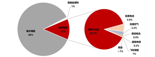 目前蓄水儲能在我國仍舊占據(jù)主要地位,是國內(nèi)主要的儲能模式,但是以電化學儲能的發(fā)展規(guī)模正在快速追趕。截至2021年底,國內(nèi)86%的儲能市場由抽水儲能構(gòu)成,而新型儲能的占比達到13%。在國內(nèi)電化學儲能市場中,鋰離子電池占據(jù)絕對主導地位,市場份額達到 89.7%。