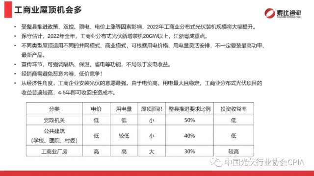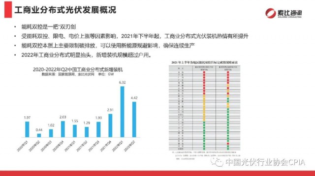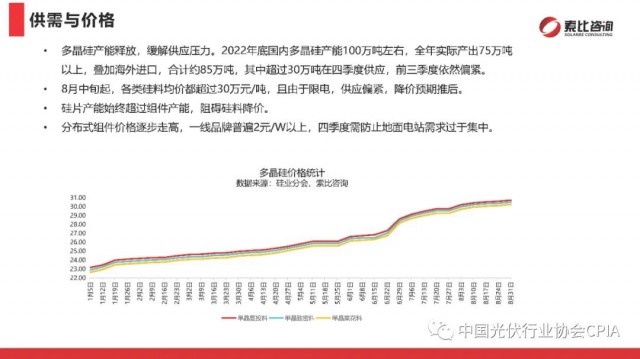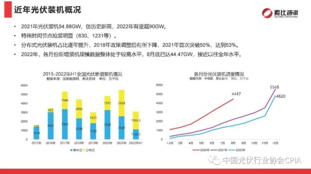 2022年9月27日,在中國(guó)光伏行業(yè)協(xié)會(huì)的指導(dǎo)和國(guó)內(nèi)領(lǐng)先的分布式戶用企業(yè)支持下,由索比光伏網(wǎng)主辦的“2022年中國(guó)戶用光伏品牌大會(huì)暨中東部省份分布式項(xiàng)目開發(fā)研討會(huì)”在浙江寧波召開。索比光伏網(wǎng)副主編尹也澤對(duì)光伏供應(yīng)鏈與分布式應(yīng)用市場(chǎng)進(jìn)行了回顧展望。尹也澤副主編分析,整體看,今年全年全國(guó)光伏發(fā)電新增裝機(jī)有望超過90GW,其中分布式光伏仍將占據(jù)“半壁江山”。