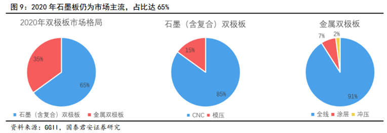 市場(chǎng)格局:仍以石墨板為主,金屬板或后來居上。氫燃料電池方面,2020年我國(guó)氫燃料電池雙極板市場(chǎng)規(guī)模達(dá)3.1億元,石墨板(包含碳塑復(fù)合板)和金屬板的市場(chǎng)占比分別為65%和35%,2021年石墨雙極板與金屬雙極板趨于平分秋色。GGII數(shù)據(jù)顯示,2021年H1金屬雙極板出貨量在雙極板總出貨量的占比已達(dá)45.0%(2020年同期為36.0%)。釩液流電池方面,基本不考慮金屬板,即使是涂層處理后的金屬板,在酸性液體環(huán)境中也難以長(zhǎng)期穩(wěn)定工作。石墨雙極板(機(jī)加工)不被看好,因?yàn)槠錂C(jī)加工過程復(fù)雜且成本高。釩液流電池主要采用碳塑復(fù)合板,因?yàn)槠錈崴芑蚰汗に囅鄬?duì)機(jī)加工簡(jiǎn)單,但是混合高分子樹脂所帶來的電阻率增加仍是需要解決的問題。
