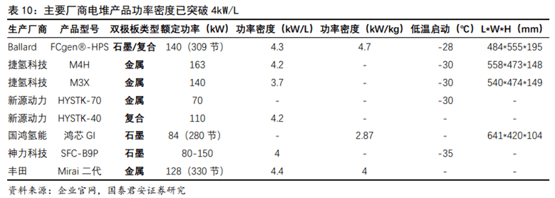 石墨板適應(yīng)需求趨于薄型化,乘用車為金屬板帶來機(jī)遇。石墨板:由于其高耐腐蝕性、高耐久性,以及相對(duì)較低的技術(shù)壁壘,率先實(shí)現(xiàn)國(guó)產(chǎn)化,在對(duì)體積較不敏感而對(duì)耐久性敏感的特種車、商用車領(lǐng)域示范應(yīng)用。然而,石墨雙極板的制作周期長(zhǎng)、機(jī)械性能差、加工難度大、制作成本高等劣勢(shì)也不可忽視。市場(chǎng)已有越來越多的企業(yè)成功開發(fā)出超薄超精細(xì)石墨雙極板,提前突破了國(guó)家制定2025年前單組石墨雙極板厚度1.5mm的要求,功率密度開始接近豐田第一代金屬雙極板的水平。金屬板:抗腐蝕性差,壽命過短是其應(yīng)用的阻礙,然而隨著涂層工藝的持續(xù)進(jìn)步與突破,其有望實(shí)現(xiàn)和石墨板相同的使用壽命。豐田汽車公司率先在旗下Mirai燃料電池汽車上使用金屬雙極板和涂層,解決了腐蝕、成本和導(dǎo)電等一系列問題。憑借其機(jī)械性能優(yōu)異、高體積功率密度、成本低廉且易批量生產(chǎn)等優(yōu)勢(shì),金屬雙極板將在乘用車規(guī)?;瘧?yīng)用的進(jìn)程中實(shí)現(xiàn)突破。