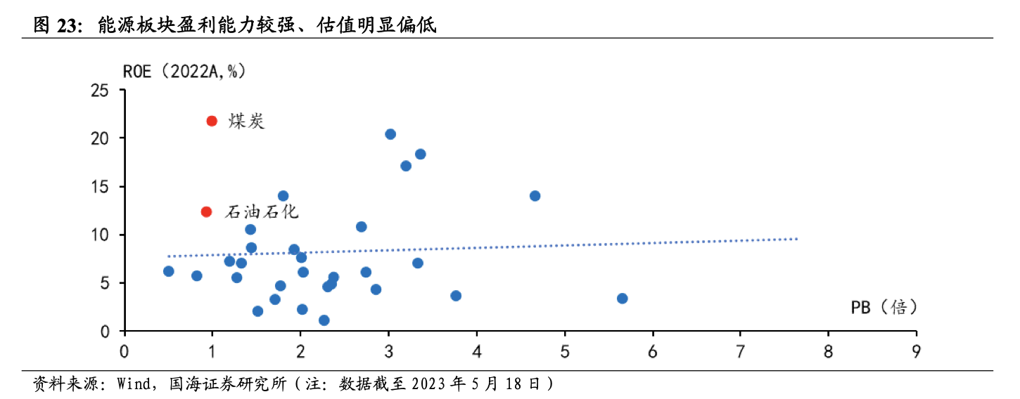 國海證券6月8日研報表示,能源板塊中上市公司擁有較為優(yōu)質(zhì)的基本面和偏低的市場估值,處于優(yōu)質(zhì)資產(chǎn)被低估的狀態(tài)。根據(jù)國海證券6月8日研報測算,截止到5月24日,石油石化、煤炭、公用事業(yè)2022年全年的ROE分別為12.32%、21.74%、5.59%,盈利能力較強,且PB十年分位分別為 8.3%、35.9%、37.8%,能源是優(yōu)質(zhì)資產(chǎn)被低估的主要領(lǐng)域,調(diào)整過后仍具備性價比。