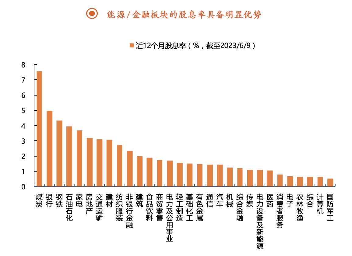 與此同時,平安證券研報指出,在“中特估+分紅”細(xì)分主線下能源領(lǐng)域有望顯著受益。根據(jù)近12個月股息率(截至2023/6/9),能源股息率具備明顯優(yōu)勢,煤炭、鋼鐵、石油化工股息率均位列前五。