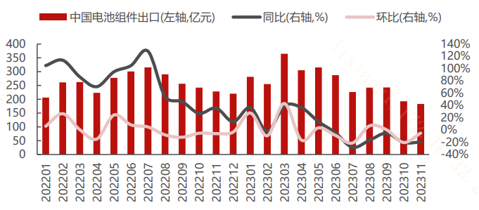 產(chǎn)業(yè)鏈出海維度,11月我國太陽能電池(含組件)出口金額183.06億元,同比-19.73%、環(huán)比-5.14%,自10月以來單月出口額繼續(xù)低于200億元,但同環(huán)比降幅相較10月份均有所收窄。11月逆變器出口40.22億元,同比-45.94%,環(huán)比+0.91%,環(huán)比迎來自6月以來的首次由負(fù)轉(zhuǎn)正。