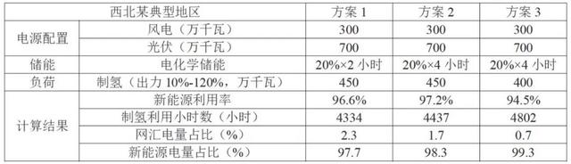 方案1與方案2的比較:采用儲(chǔ)能方式為20%×4小時(shí)時(shí)(方案2),新能源利用率較高,而網(wǎng)匯電量占比相對(duì)較低。這表明采用較大儲(chǔ)能規(guī)模能可以提高制氫利用小時(shí)數(shù)和新能源的利用效率。
