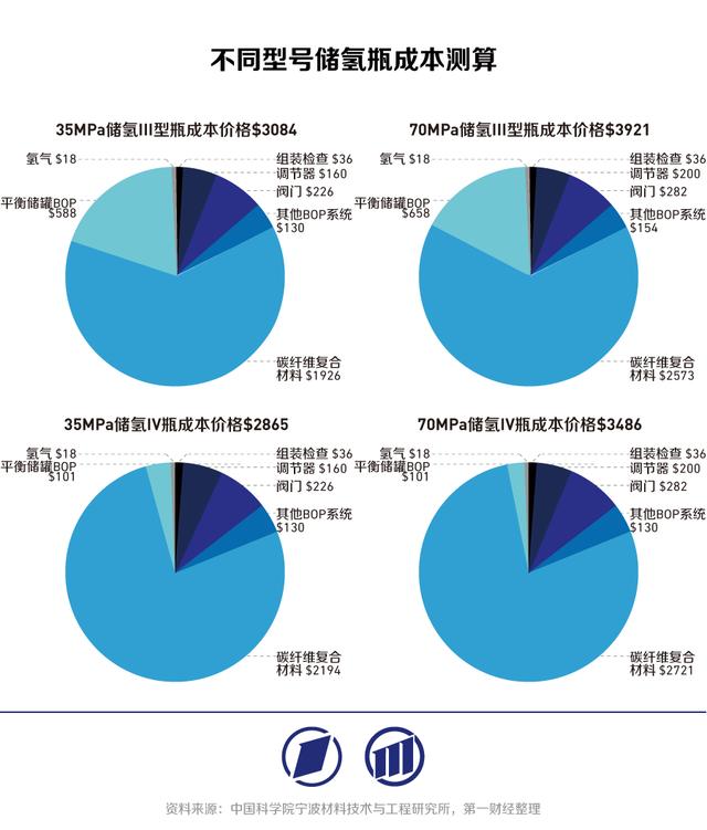 ?、粜蛢?chǔ)氫瓶不僅性能更優(yōu),成本也低于Ⅲ型儲(chǔ)氫瓶。根據(jù)中國(guó)科學(xué)院寧波材料技術(shù)與工程研究所近期的測(cè)算,35MPa、70MPa的儲(chǔ)氫Ⅲ型瓶成本價(jià)格分別為3084美元、3921美元,而35MPa、70MPa的儲(chǔ)氫Ⅳ型瓶成本價(jià)格分別為2865美元和3486美元,分別低7%和11%。