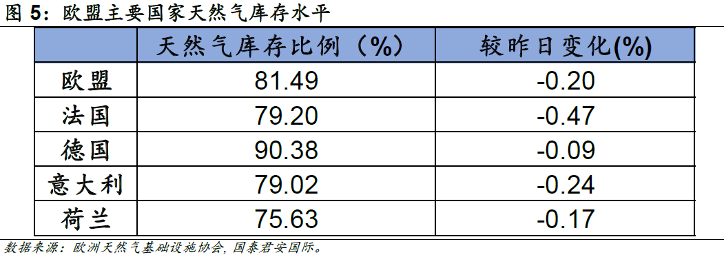 暖冬的到來(lái)極大程度上緩解了天然氣消耗的壓力,歐盟的天然氣庫(kù)存儲(chǔ)量超過(guò)最大儲(chǔ)量的80%,短期內(nèi)天然氣壓力不會(huì)顯著回升。歐洲天然氣基礎(chǔ)設(shè)施協(xié)會(huì)(GIE)數(shù)據(jù)顯示,截止2023年1月15日,歐盟27國(guó)的天然氣儲(chǔ)量超過(guò)最大儲(chǔ)量的80%,德國(guó)作為最主要的天然氣消耗國(guó),庫(kù)存儲(chǔ)量甚至超過(guò)90%。暖冬導(dǎo)致對(duì)天然氣消耗需求的減少可以在相當(dāng)程度上緩解整體天然氣需求的壓力,短期來(lái)看,天然氣需求壓力不會(huì)顯著回升,通脹壓力有望持續(xù)放緩。