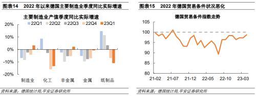 德國能源密集型行業(yè)受到的產(chǎn)出沖擊在2022年第4季度凸顯,化工和紙制品行業(yè)受到的影響尤甚。采用德國批發(fā)價格指數(shù)進(jìn)行平減,可以看到在2022上半年,德國制造業(yè)產(chǎn)出整體上受高通脹的嚴(yán)重沖擊,但能源密集型行業(yè)的產(chǎn)出表現(xiàn)存在差異,化工和紙制品行業(yè)甚至出現(xiàn)了逆勢增長。德國能源價格漲幅最大的是2022年第3季度,此時能源密集型行業(yè)已經(jīng)出現(xiàn)了較為明顯的實際產(chǎn)出下降??紤]到可能存在一定的庫存消耗和價格粘性等帶來的滯后影響,2022年4季度德國能源密集型行業(yè)產(chǎn)出受到的沖擊進(jìn)一步加大,尤其是化工行產(chǎn)出同比實際增速下降15.7%,出現(xiàn)了較大調(diào)整;金屬制品、紙制品和非金屬制品也分別下降了6.8%、6.6%和5.1%,均高于制造業(yè)整體降幅4.1%。2023年第1季度,隨著能源價格快速回落,德國整體制造業(yè)產(chǎn)出同比實際增長3.1%,但化工和紙制品行業(yè)分別同比實際下降13.2%和10.8%,拖累依然嚴(yán)重。從德國貿(mào)易條件指數(shù)來看,2021年以來德國貿(mào)易條件指數(shù)震蕩走低,尤其是在2022年能源價格走高后,貿(mào)易條件指數(shù)加速下滑,于2022年8月降至低點89.3%,即使之后恢復(fù)增長,截至2023年4月仍然小于100。貿(mào)易條件指數(shù)的惡化充分反映了本輪能源危機(jī)對德國貿(mào)易的負(fù)面沖擊。