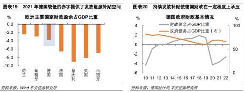 德國財政收支情況較好,為其應(yīng)對本輪能源危機(jī)沖擊奠定了基礎(chǔ)。2012年之后,德國財政盈余連續(xù)八年為正,直到2020年新冠疫情,德國財政盈余轉(zhuǎn)負(fù),之后連續(xù)三年德國財政盈余均為負(fù)。2021年,德國的財政赤字為3.7%,2022年為2.6%,在歐洲主要國家中要高于荷蘭和葡萄牙,但遠(yuǎn)低于意大利、英國等國家。德國較低的財政赤字為其提供多次發(fā)放能源補(bǔ)貼的操作空間。德國政府債務(wù)占GDP的比例在 2021年抬升至69.3%;但受高通脹影響,2022年德國名義GDP的同比增長高達(dá)7.4%,在一定程度緩解了杠桿率壓力,2022年德國政府債務(wù)占GDP的比例降至66.3%。