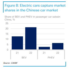去年,電動(dòng)汽車在中國的市場份額繼續(xù)擴(kuò)大。純電動(dòng)汽車在乘用車總銷量中的份額從2021年的12.7%擴(kuò)大到2022年的21.3%,而插電式混合動(dòng)力汽車的市場份額從2.8%增加到6.4%,增長了一倍多。