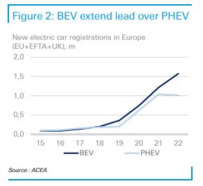盡管近年來歐洲新車總注冊量有所下降,但電動(dòng)汽車的新注冊量卻穩(wěn)步上升。 2022年,歐洲新注冊的電動(dòng)汽車不到260萬輛,同比增長14.6%,其中包括近160萬輛純電動(dòng)汽車(BEV)和100萬輛插電式混合動(dòng)力車(PHEV)。 這也使電動(dòng)汽車在2022年新乘用車總注冊量中的份額增加到22.9%,2021年為19.2%。