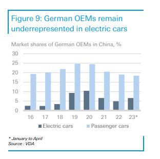 然而,德國品牌在中國的電動(dòng)汽車市場份額相當(dāng)?shù)?,多年來,德國品牌在中國乘用車銷量中占有相當(dāng)高的市場份額,約為23%。然而,到2021年和2022年,這一比例分別降至20.5%和19%。這可能是由于德國制造商受到上游產(chǎn)品短缺的影響比當(dāng)?shù)馗偁帉κ指鼑?yán)重,而中國制造商在更大程度上占據(jù)了批量細(xì)分市場。