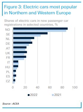 在歐洲,電動(dòng)汽車增長勢頭強(qiáng)勁,2022年純電動(dòng)汽車和插電式汽車市場份額為22.9%。在北歐,新注冊電動(dòng)汽車的市場份額最高。電動(dòng)汽車在東歐和南歐的市場份額仍然不足。購買價(jià)格高、收入低以及充電基礎(chǔ)設(shè)施不發(fā)達(dá)是造成這種情況的原因。