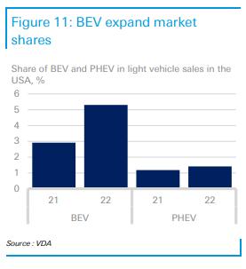 電動(dòng)汽車在美國仍是一個(gè)小眾市場,但美國的監(jiān)管框架有所改善。與整體市場相比,德國品牌在美國電動(dòng)汽車市場的份額相當(dāng)高,2022年為11%。