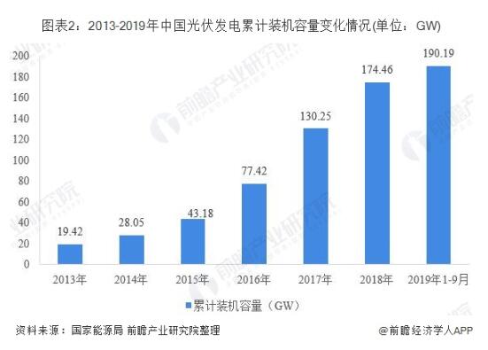累計(jì)裝機(jī)容量方面,據(jù)國家能源局統(tǒng)計(jì)數(shù)據(jù)顯示,2013年以來,我國光伏發(fā)電累計(jì)裝機(jī)容量增長迅速。2013年,全國光伏發(fā)電累計(jì)裝機(jī)容量僅為19.42GW,到2018年已經(jīng)增長至174.46GW。預(yù)計(jì)2013-2019年,全國光伏發(fā)電累計(jì)裝機(jī)容量將有近10倍增長。截至2019年9月底,全國光伏發(fā)電累計(jì)裝機(jī)190.19GW,同比增長15%。