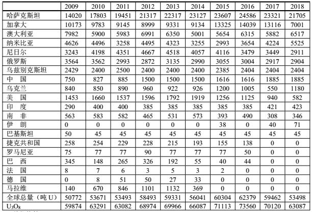 2009-2018期間各國(guó)鈾產(chǎn)量